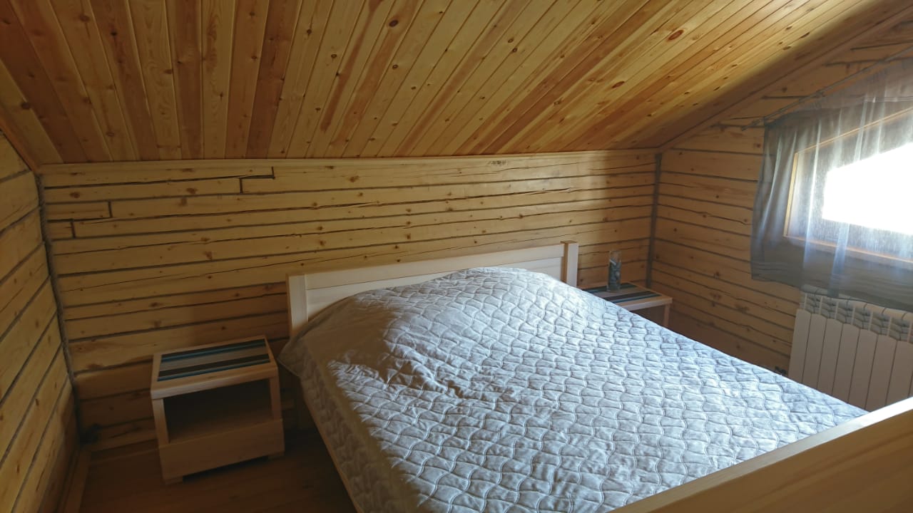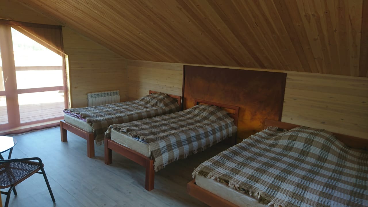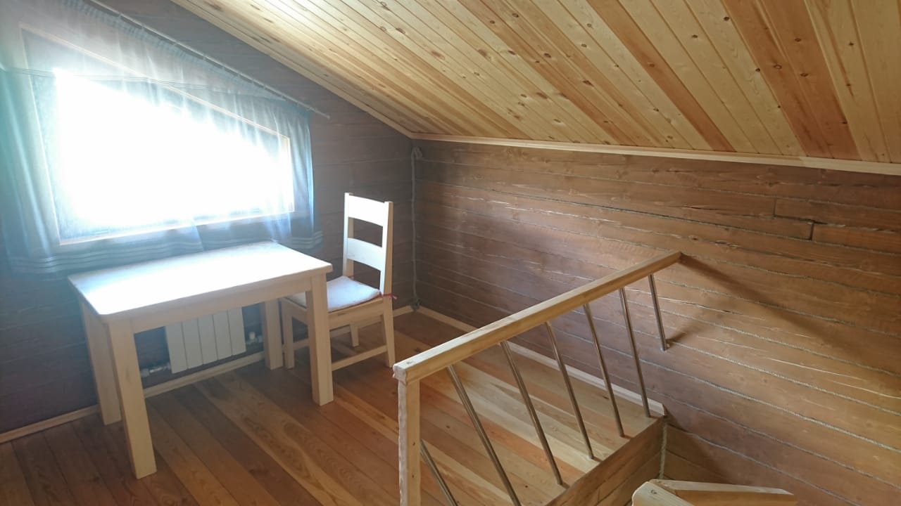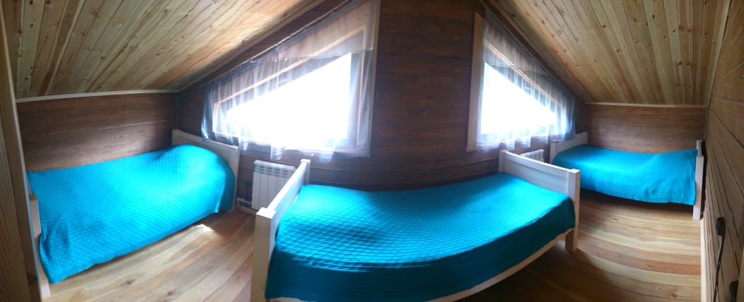 3 | две 2-спальные и три 1-спальные | кухня-гостиная (1 этаж): диван, большой стол, стулья, кухонная тумба с мойкой, чайник, холодильник, мультиварка две спальные комнаты (2 этаж) : в одной 2-спальная кровать, во второй – три 1-спальные и 2-спальная |