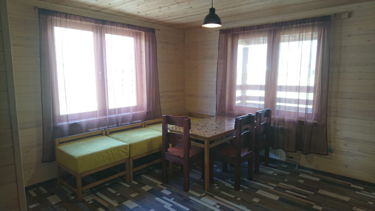 3 | 2-спальная и 3 1-спальные | кухня-гостиная (1 этаж): диван, большой стол, стулья, кухонная тумба с мойкой, чайник, холодильник, мультиварка две спальные комнаты (2 этаж) : в одной 2-спальная кровать, во второй – три 1-спальные |
