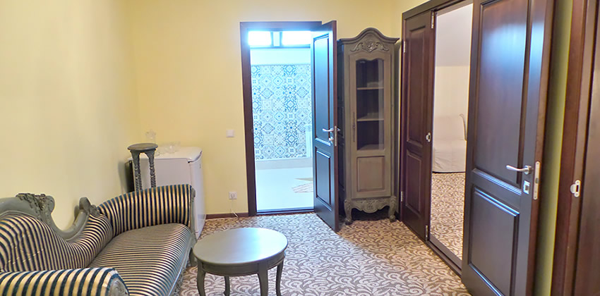 2 | 2-спальная, кресло кровать | 65 м2/ 72 м2 в спальной комнате: шкаф, тумбочки, кресло, пуф, консоль для туалетных принадлежностей в гостиной: шкаф, диван, кресло-кровать, журнальный столик, стол, стулья, телевизор в холле: холодильник, чайник, набор чайной посуды, чай, кофе, вода, диван, вешалка для верхней одежды, обувная полка |