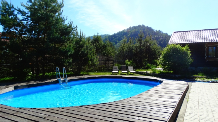 открытый бассейн, размер 4х6 м, естественный нагрев, комплексная система очистки, площадка для загара, лежаки, зонтики, пользование бесплатно (для проживающих на б/о)