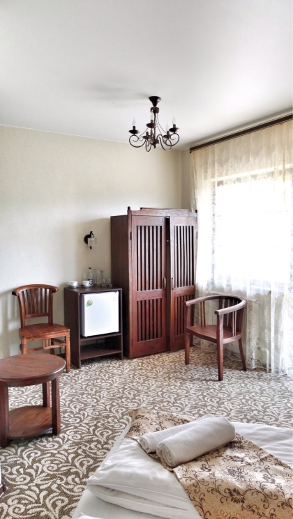 тумбочки, шкаф для одежды, столик, стулья, телевизор, холодильник, набор посуды | есть, общий на 2 номера | туалет, умывальник, душевая кабина | раскладная кровать | |