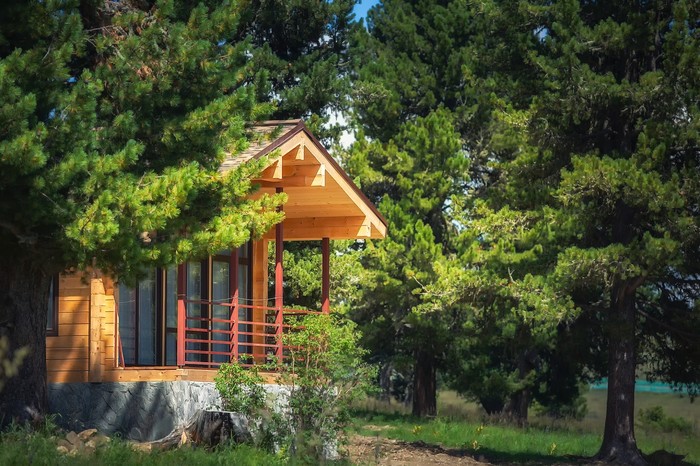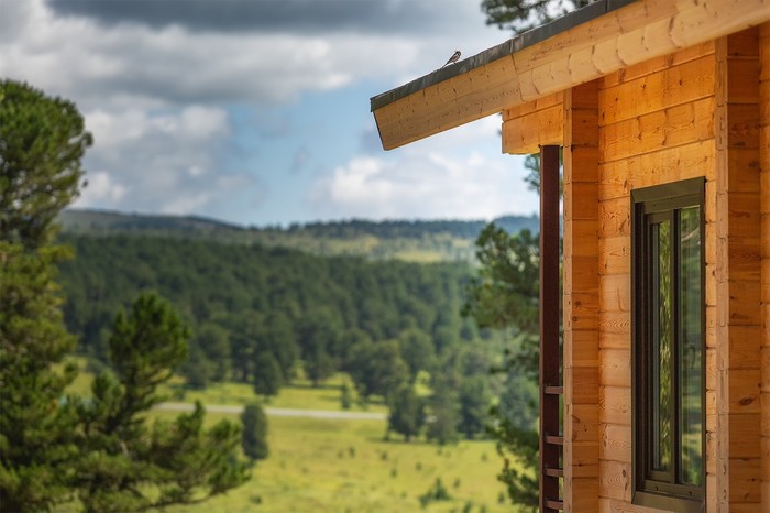 отдельностоящий коттедж с террасой и панорамными окнами |