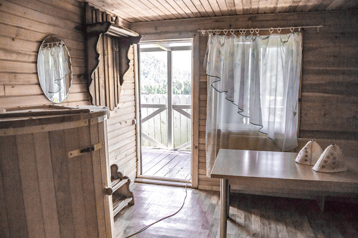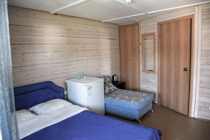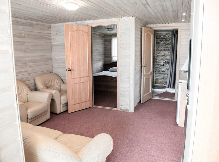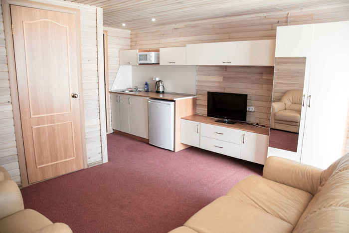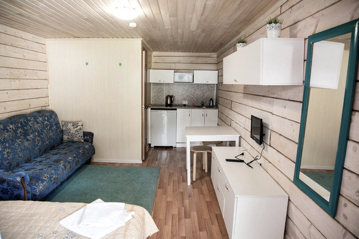 1 2-спальная/две 1-спальные 28 м2, шифоньер, два кресла, тумбочка, полка для обуви, зеркало, сейф, консоль, телевизор, кухонная зона (холодильник, чайник, микроволновая печь, набор посуды), мультиварка (по запросу у администратора) туалет, умывальник, душ диван-книжка