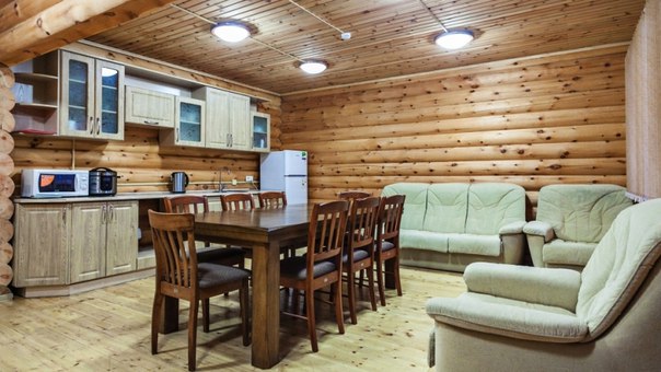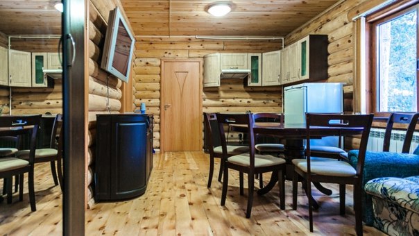 1 этаж большой холл: угловой диван, телевизор, обеденная зонаоборудованная кухня: холодильник, эл. плита, микроволновая печь, чайник, набор посуды, кухонная мебель
