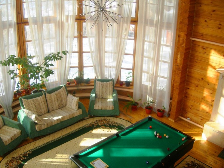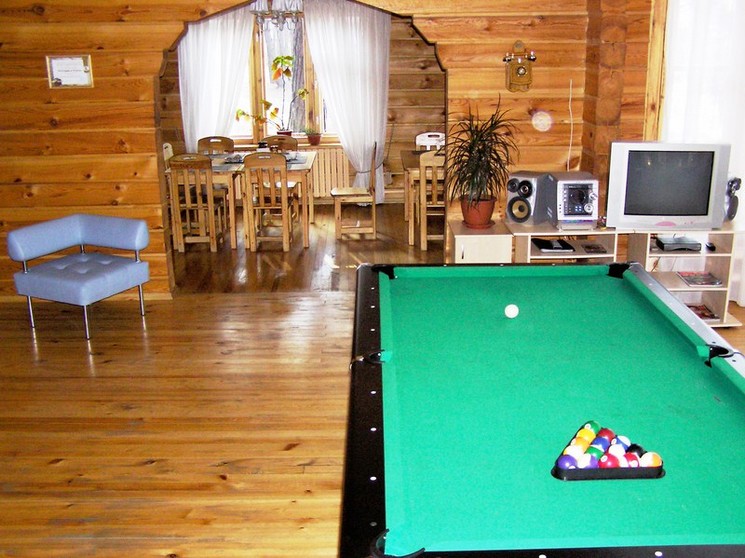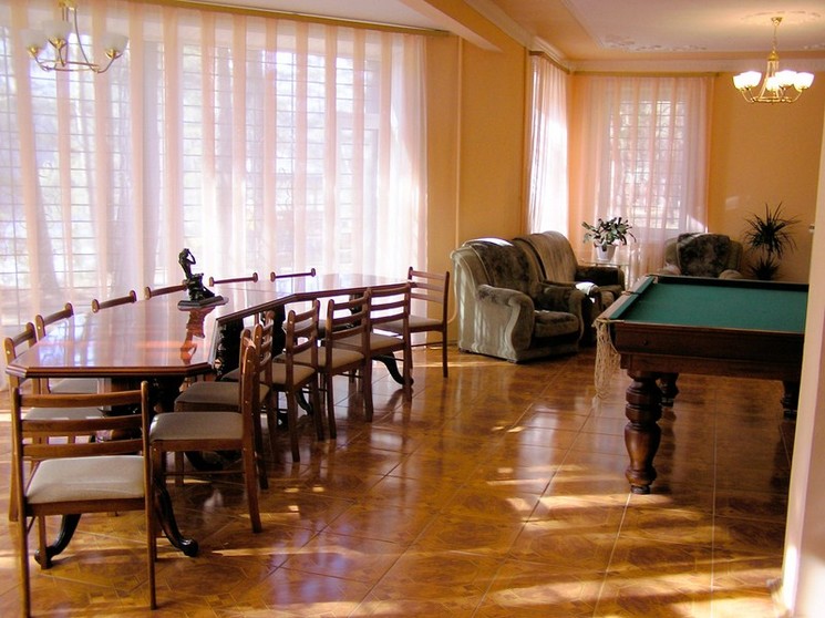 на первом этаже: большой холл с витражами, диван, оборудованная кухня (холодильник, плита, микроволновая печь, эл. чайник, набор посуды), обеденная зона, пул, муз. центр, телевизор (спутн. ТВ), DVD