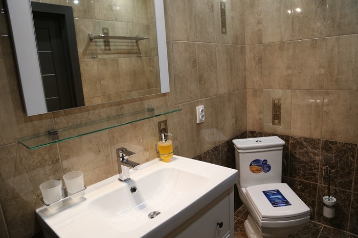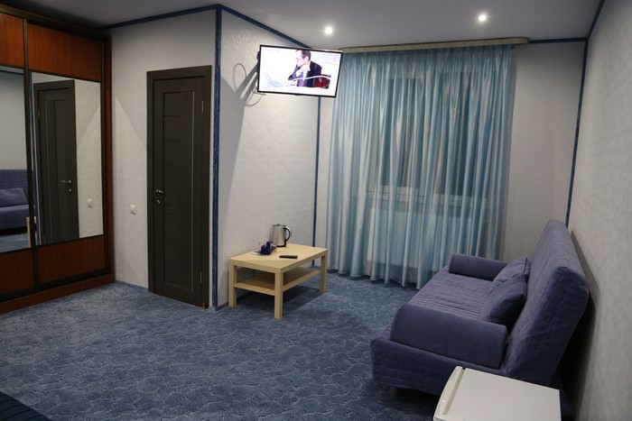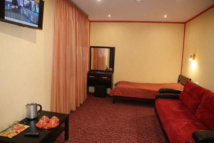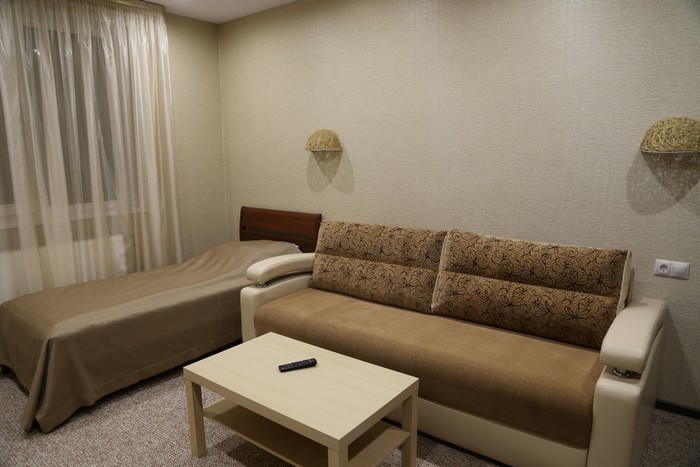 1 | 2-спальная | 24 м2, прихожая, тумбочки, диван, стол, стулья, шкаф, чайник, телевизор, холодильник | да | туалет, умывальник, душевая кабина, фен, халаты | диван |