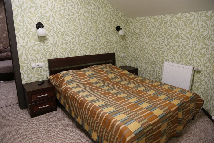 1 | 2-спальная | 1 этаж, 22 м2, диван, тумбочки, шкаф, стол, стулья, телевизор, холодильник, чайник | нет | туалет, умывальник, душевая кабина, фен, халаты | диван |