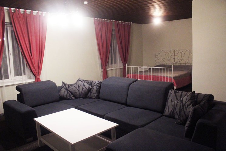 номер-студия тумбочки, диван (не раскладывается), журнальный столик, стулья, шкаф, телевизор, холодильник, чайник